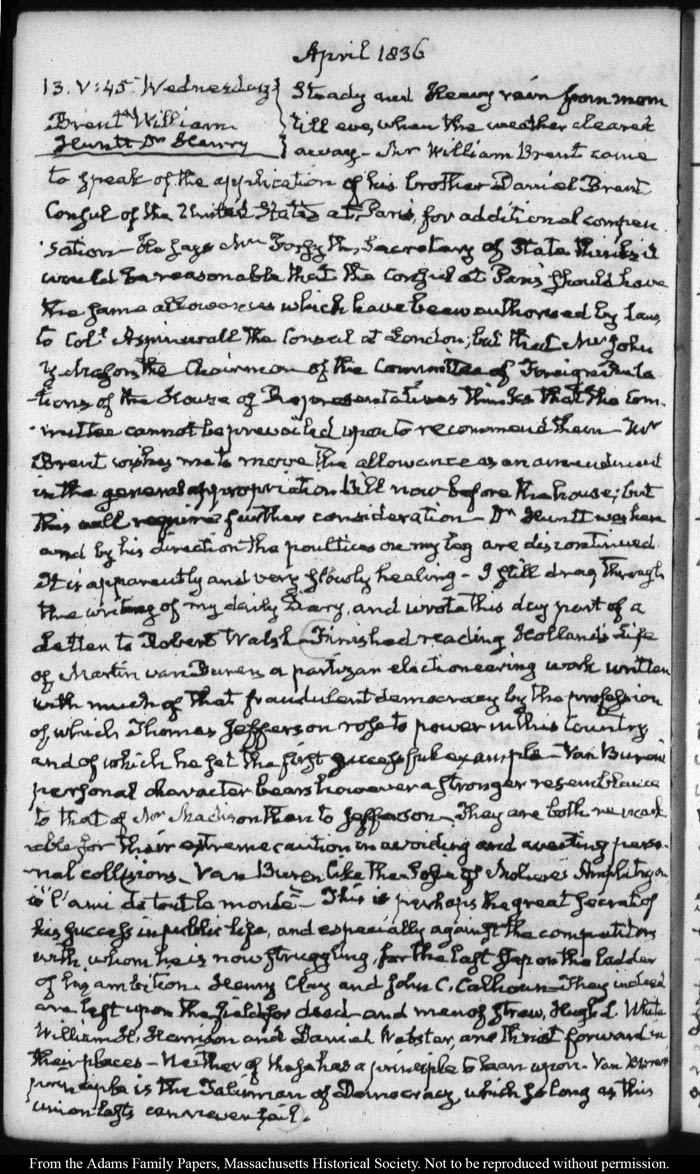 View full, authoritative transcriptions with page images of the diaries at John Quincy Adams Digital Diary part of the Primary Source Cooperative at the MHS.