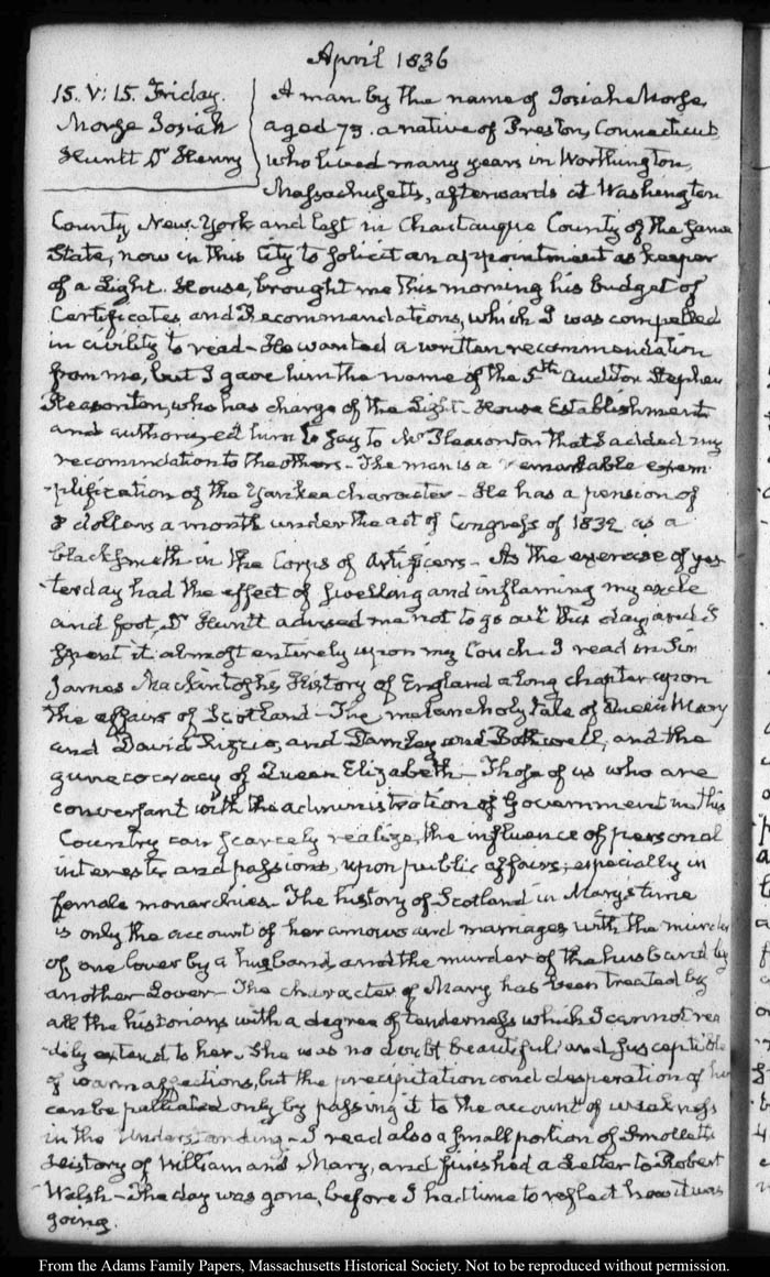 View full, authoritative transcriptions with page images of the diaries at John Quincy Adams Digital Diary part of the Primary Source Cooperative at the MHS.