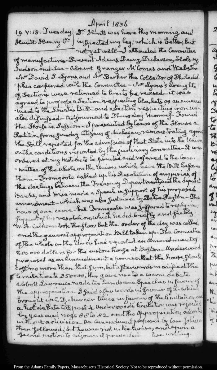 View full, authoritative transcriptions with page images of the diaries at John Quincy Adams Digital Diary part of the Primary Source Cooperative at the MHS.