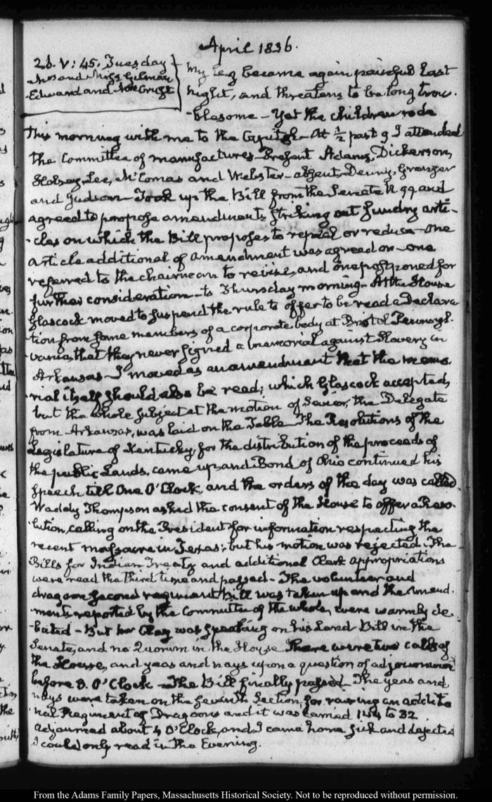View full, authoritative transcriptions with page images of the diaries at John Quincy Adams Digital Diary part of the Primary Source Cooperative at the MHS.