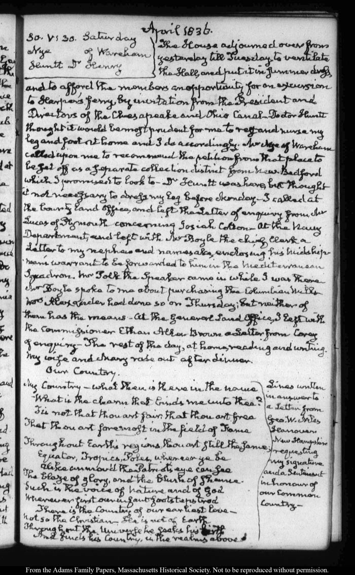 View full, authoritative transcriptions with page images of the diaries at John Quincy Adams Digital Diary part of the Primary Source Cooperative at the MHS.