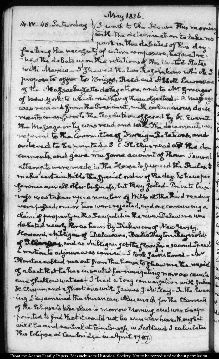 View full, authoritative transcriptions with page images of the diaries at John Quincy Adams Digital Diary part of the Primary Source Cooperative at the MHS.