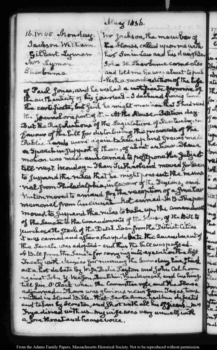 View full, authoritative transcriptions with page images of the diaries at John Quincy Adams Digital Diary part of the Primary Source Cooperative at the MHS.