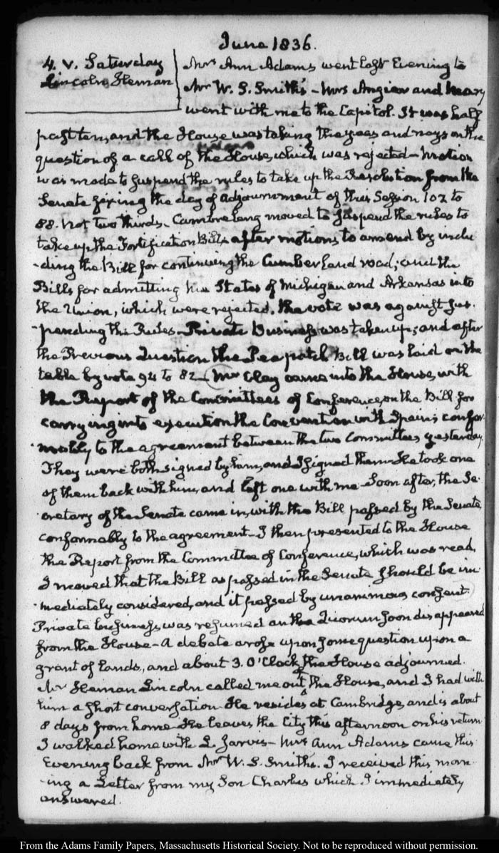 View full, authoritative transcriptions with page images of the diaries at John Quincy Adams Digital Diary part of the Primary Source Cooperative at the MHS.