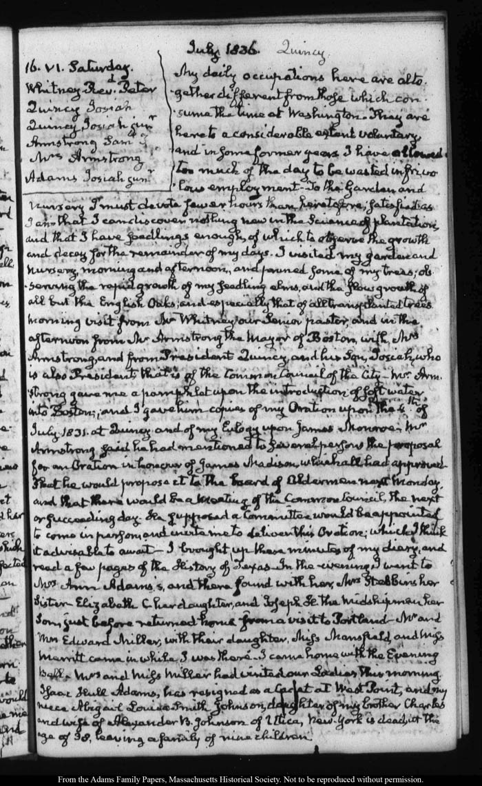 View full, authoritative transcriptions with page images of the diaries at John Quincy Adams Digital Diary part of the Primary Source Cooperative at the MHS.