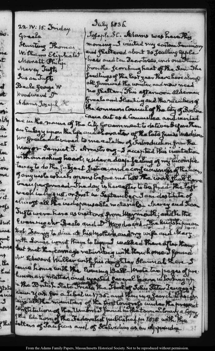 View full, authoritative transcriptions with page images of the diaries at John Quincy Adams Digital Diary part of the Primary Source Cooperative at the MHS.