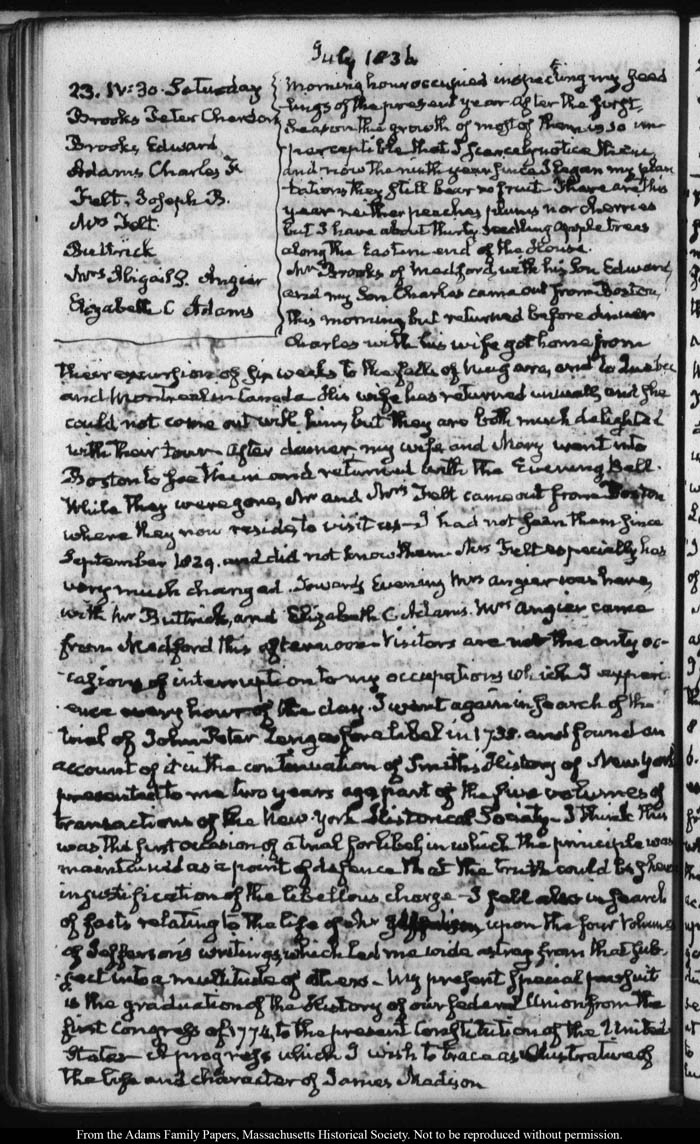 View full, authoritative transcriptions with page images of the diaries at John Quincy Adams Digital Diary part of the Primary Source Cooperative at the MHS.