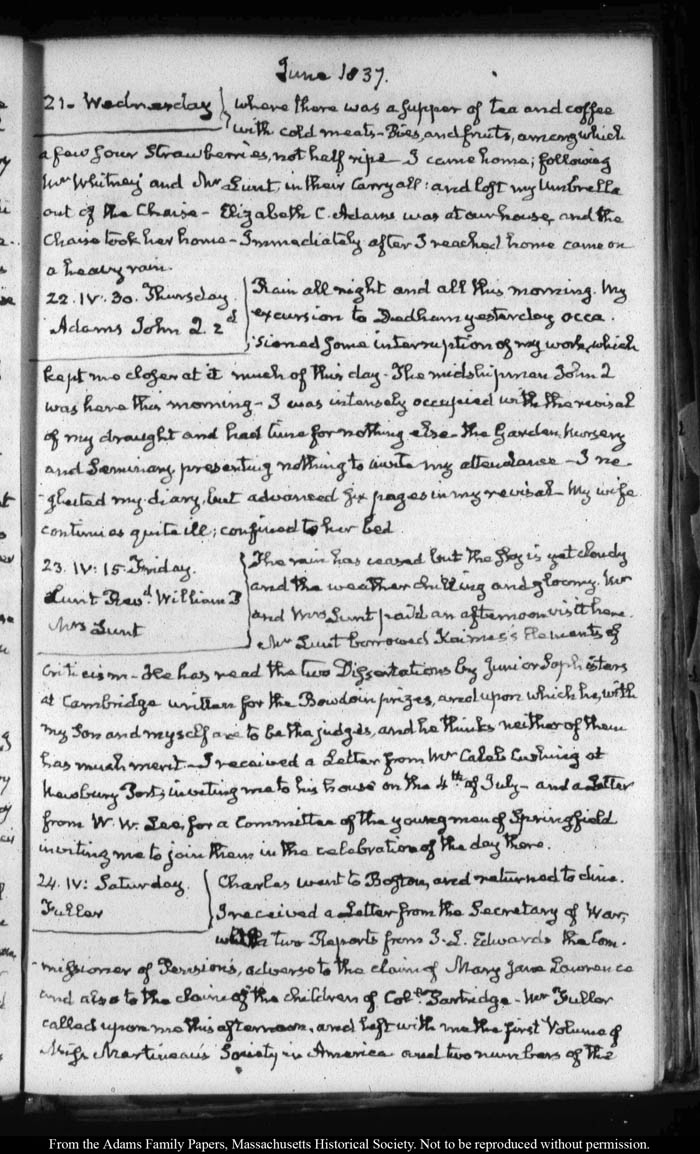 View full, authoritative transcriptions with page images of the diaries at John Quincy Adams Digital Diary part of the Primary Source Cooperative at the MHS.