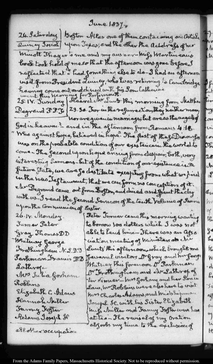 View full, authoritative transcriptions with page images of the diaries at John Quincy Adams Digital Diary part of the Primary Source Cooperative at the MHS.