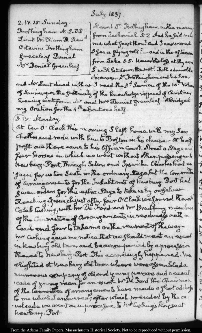 View full, authoritative transcriptions with page images of the diaries at John Quincy Adams Digital Diary part of the Primary Source Cooperative at the MHS.