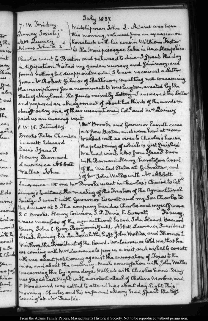 View full, authoritative transcriptions with page images of the diaries at John Quincy Adams Digital Diary part of the Primary Source Cooperative at the MHS.