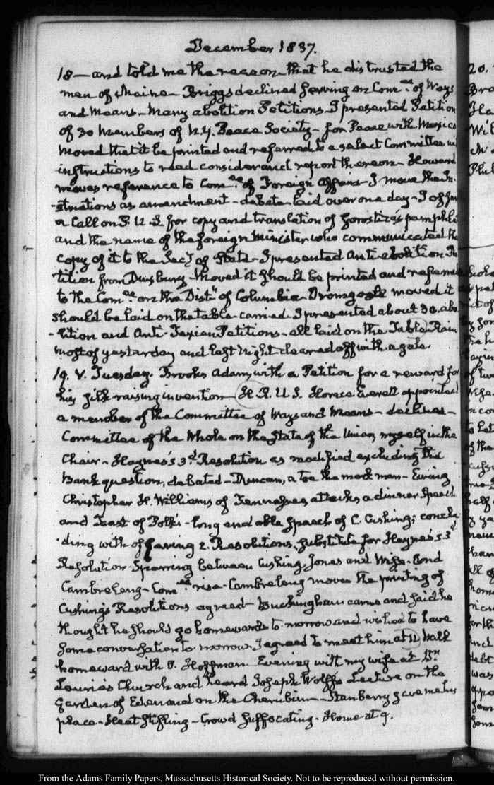 View full, authoritative transcriptions with page images of the diaries at John Quincy Adams Digital Diary part of the Primary Source Cooperative at the MHS.