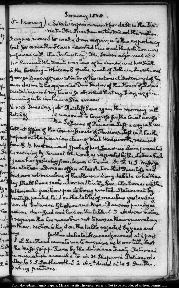 View full, authoritative transcriptions with page images of the diaries at John Quincy Adams Digital Diary part of the Primary Source Cooperative at the MHS.