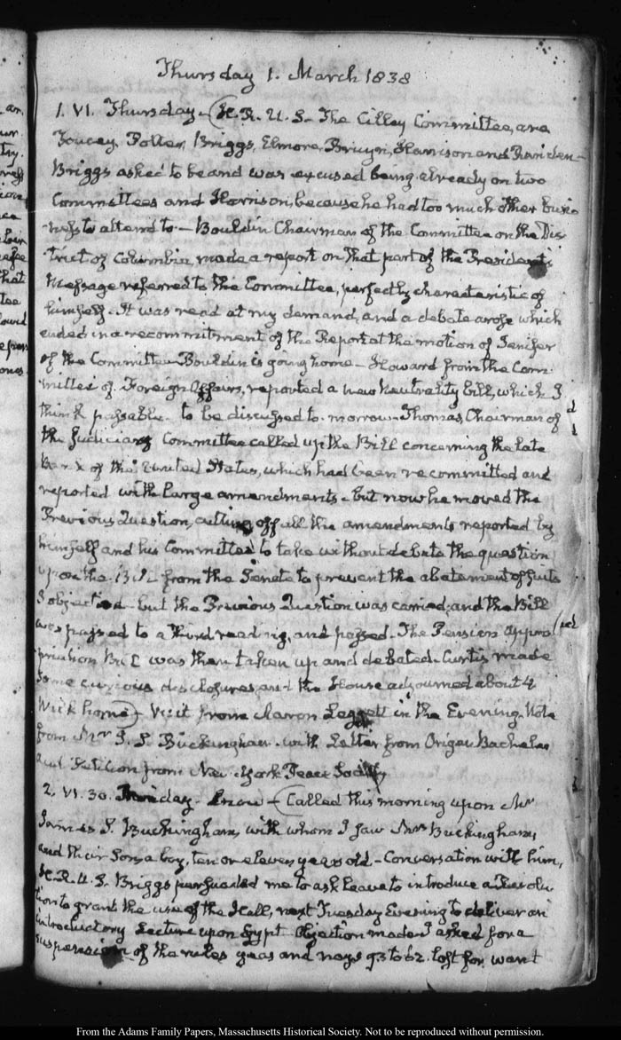 View full, authoritative transcriptions with page images of the diaries at John Quincy Adams Digital Diary part of the Primary Source Cooperative at the MHS.