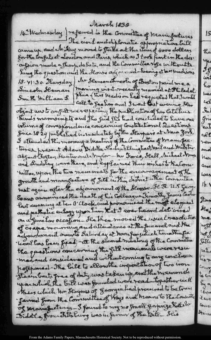 View full, authoritative transcriptions with page images of the diaries at John Quincy Adams Digital Diary part of the Primary Source Cooperative at the MHS.