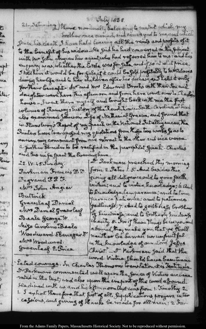 View full, authoritative transcriptions with page images of the diaries at John Quincy Adams Digital Diary part of the Primary Source Cooperative at the MHS.