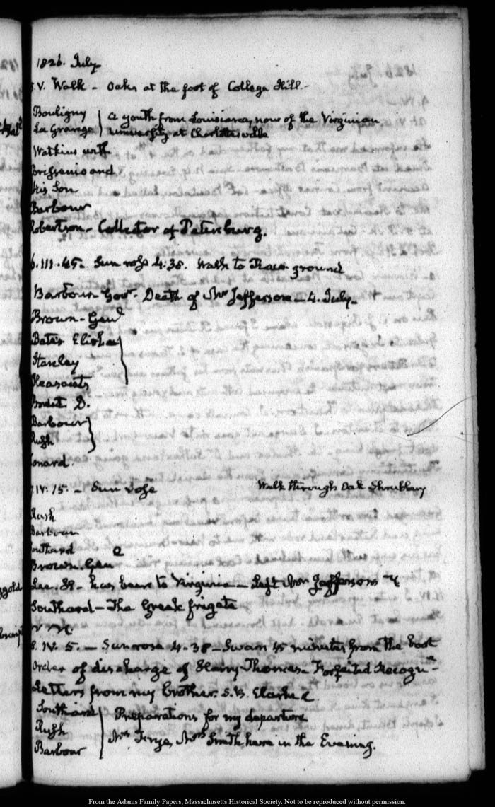 View full, authoritative transcriptions with page images of the diaries at John Quincy Adams Digital Diary part of the Primary Source Cooperative at the MHS.