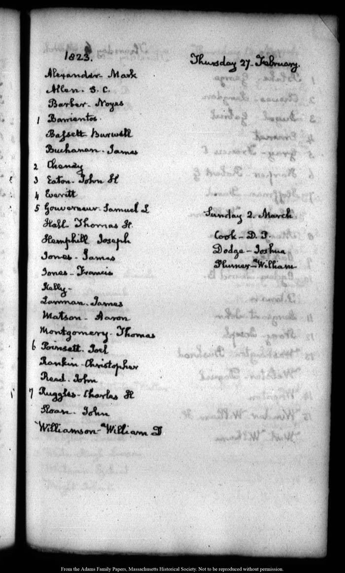 View full, authoritative transcriptions with page images of the diaries at John Quincy Adams Digital Diary part of the Primary Source Cooperative at the MHS.
