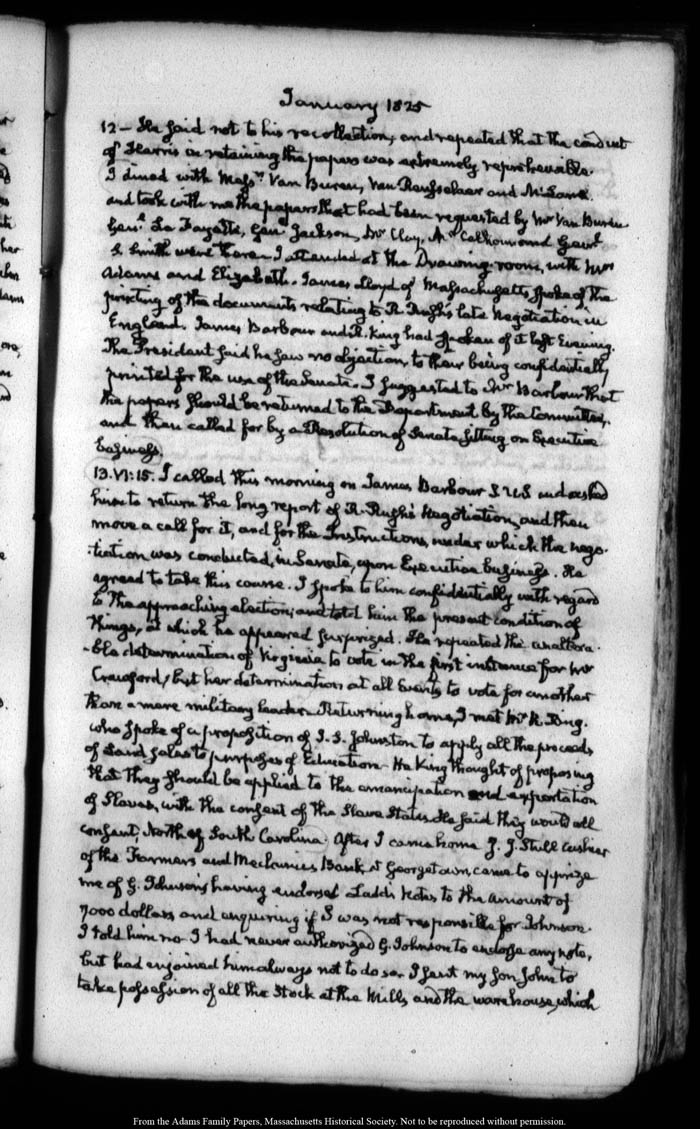 View full, authoritative transcriptions with page images of the diaries at John Quincy Adams Digital Diary part of the Primary Source Cooperative at the MHS.