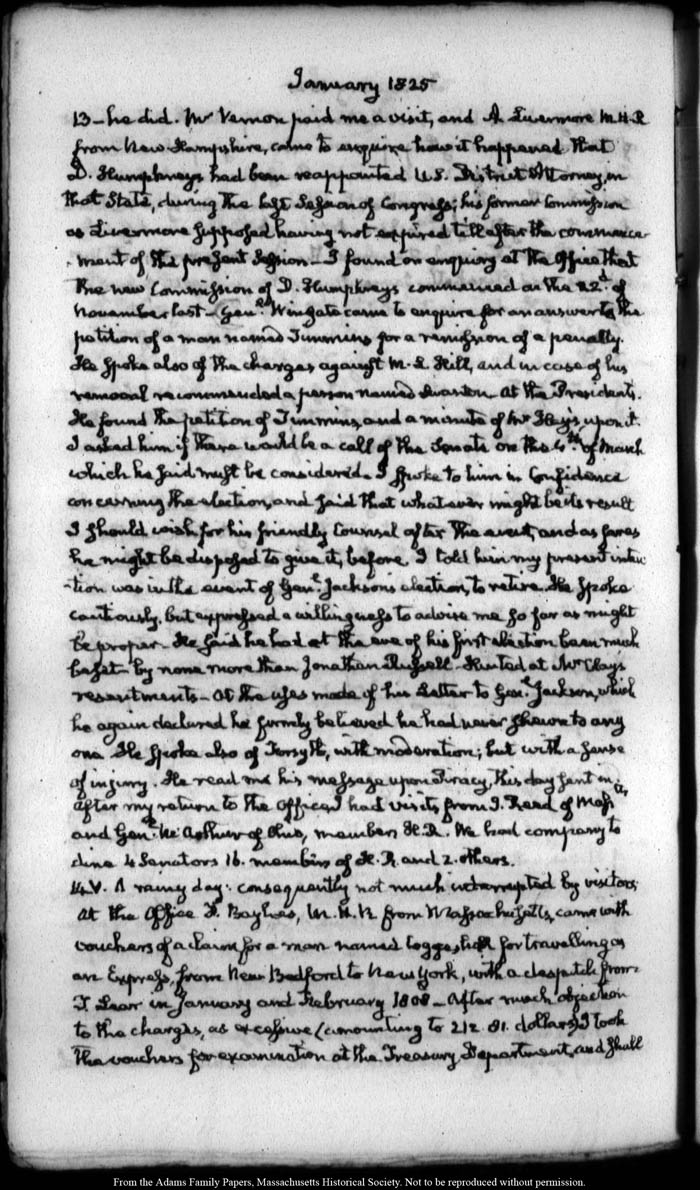 View full, authoritative transcriptions with page images of the diaries at John Quincy Adams Digital Diary part of the Primary Source Cooperative at the MHS.
