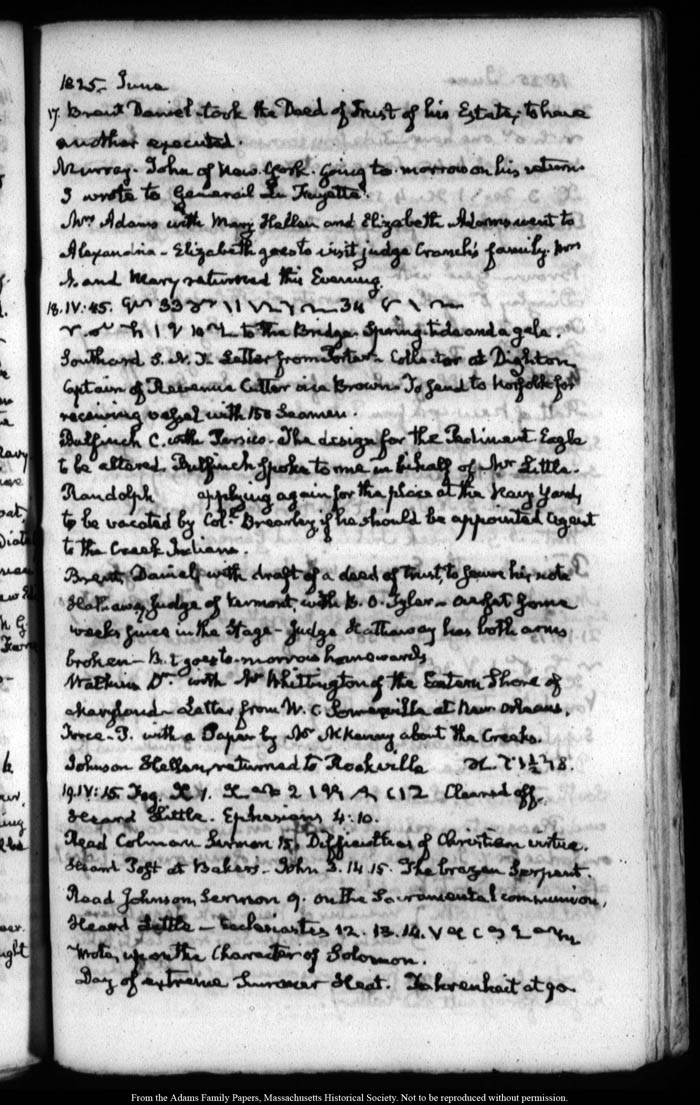 View full, authoritative transcriptions with page images of the diaries at John Quincy Adams Digital Diary part of the Primary Source Cooperative at the MHS.
