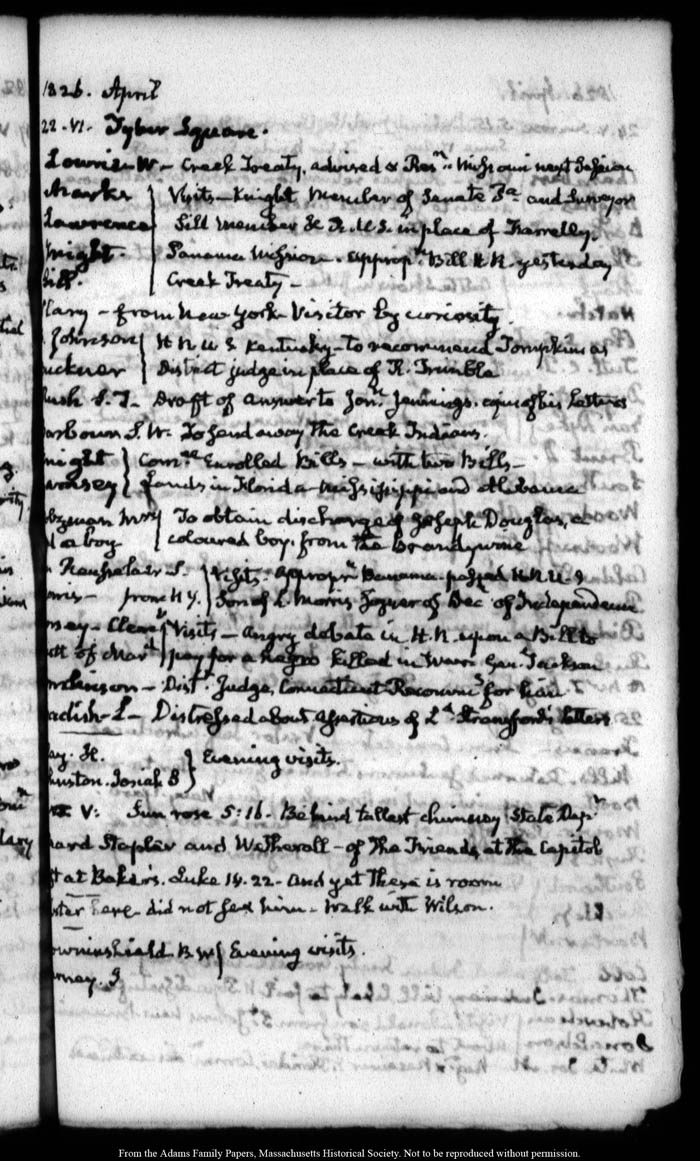 View full, authoritative transcriptions with page images of the diaries at John Quincy Adams Digital Diary part of the Primary Source Cooperative at the MHS.