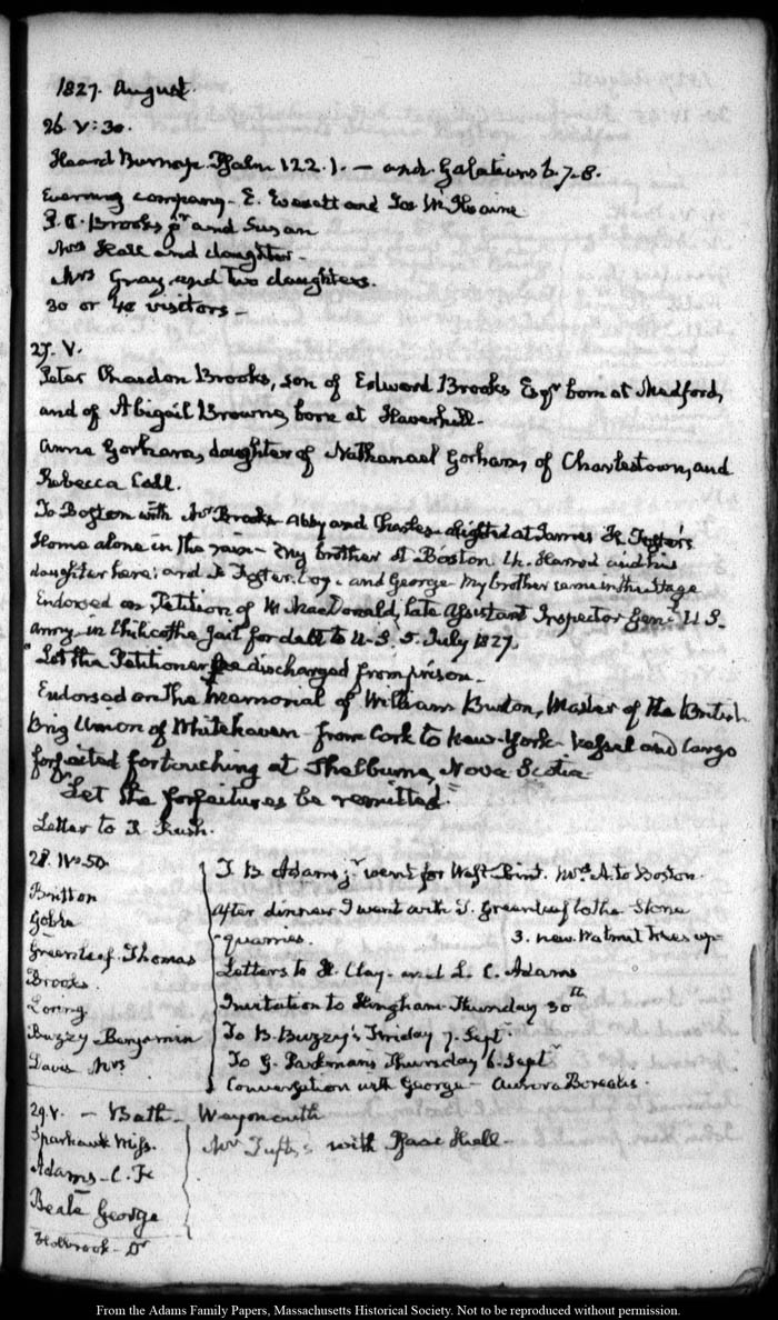 View full, authoritative transcriptions with page images of the diaries at John Quincy Adams Digital Diary part of the Primary Source Cooperative at the MHS.