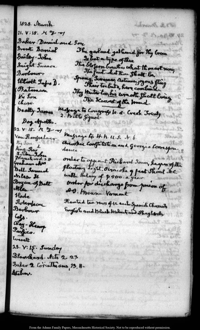 View full, authoritative transcriptions with page images of the diaries at John Quincy Adams Digital Diary part of the Primary Source Cooperative at the MHS.