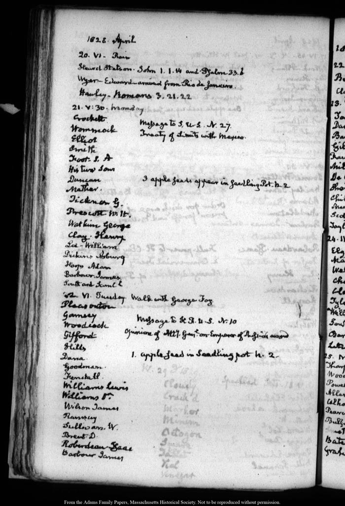 View full, authoritative transcriptions with page images of the diaries at John Quincy Adams Digital Diary part of the Primary Source Cooperative at the MHS.