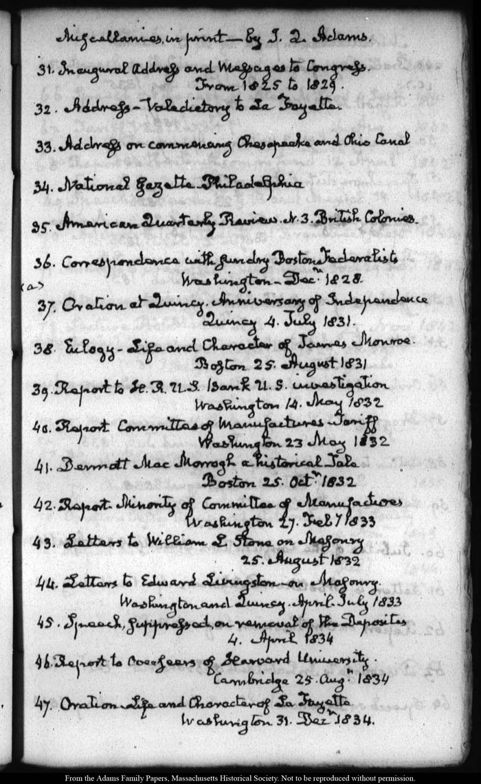 View full, authoritative transcriptions with page images of the diaries at John Quincy Adams Digital Diary part of the Primary Source Cooperative at the MHS.