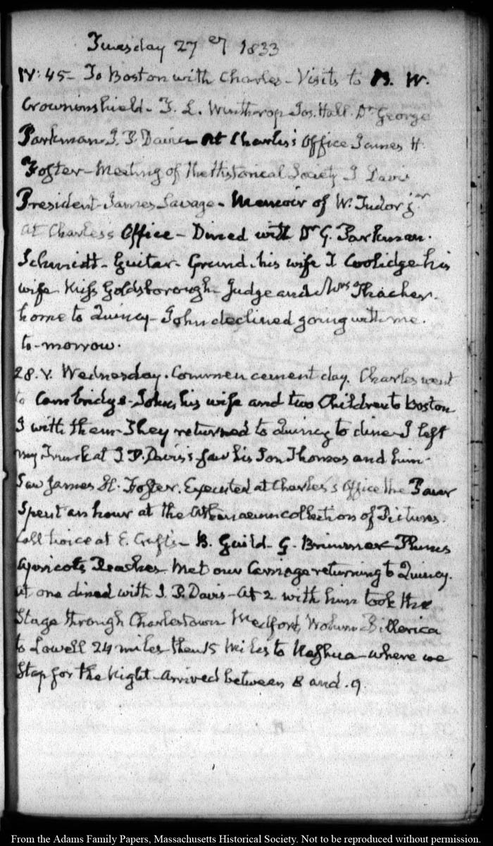 View full, authoritative transcriptions with page images of the diaries at John Quincy Adams Digital Diary part of the Primary Source Cooperative at the MHS.