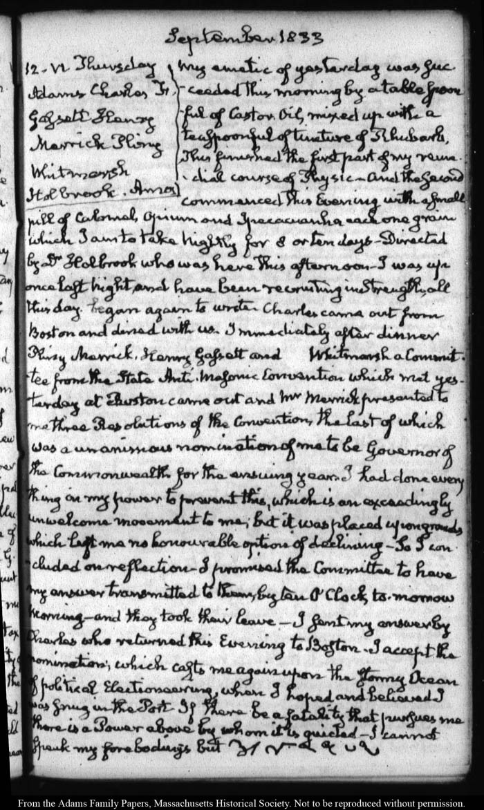 View full, authoritative transcriptions with page images of the diaries at John Quincy Adams Digital Diary part of the Primary Source Cooperative at the MHS.