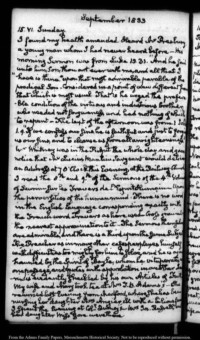 View full, authoritative transcriptions with page images of the diaries at John Quincy Adams Digital Diary part of the Primary Source Cooperative at the MHS.