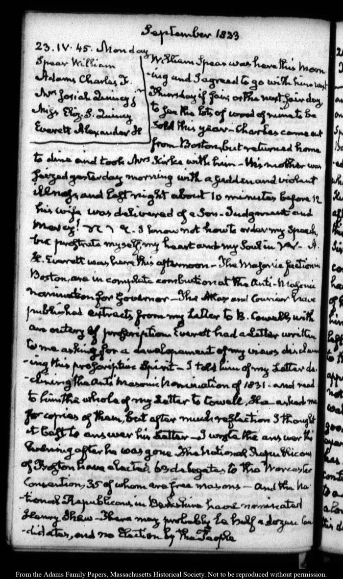 View full, authoritative transcriptions with page images of the diaries at John Quincy Adams Digital Diary part of the Primary Source Cooperative at the MHS.
