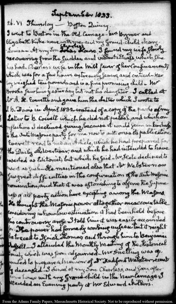 View full, authoritative transcriptions with page images of the diaries at John Quincy Adams Digital Diary part of the Primary Source Cooperative at the MHS.