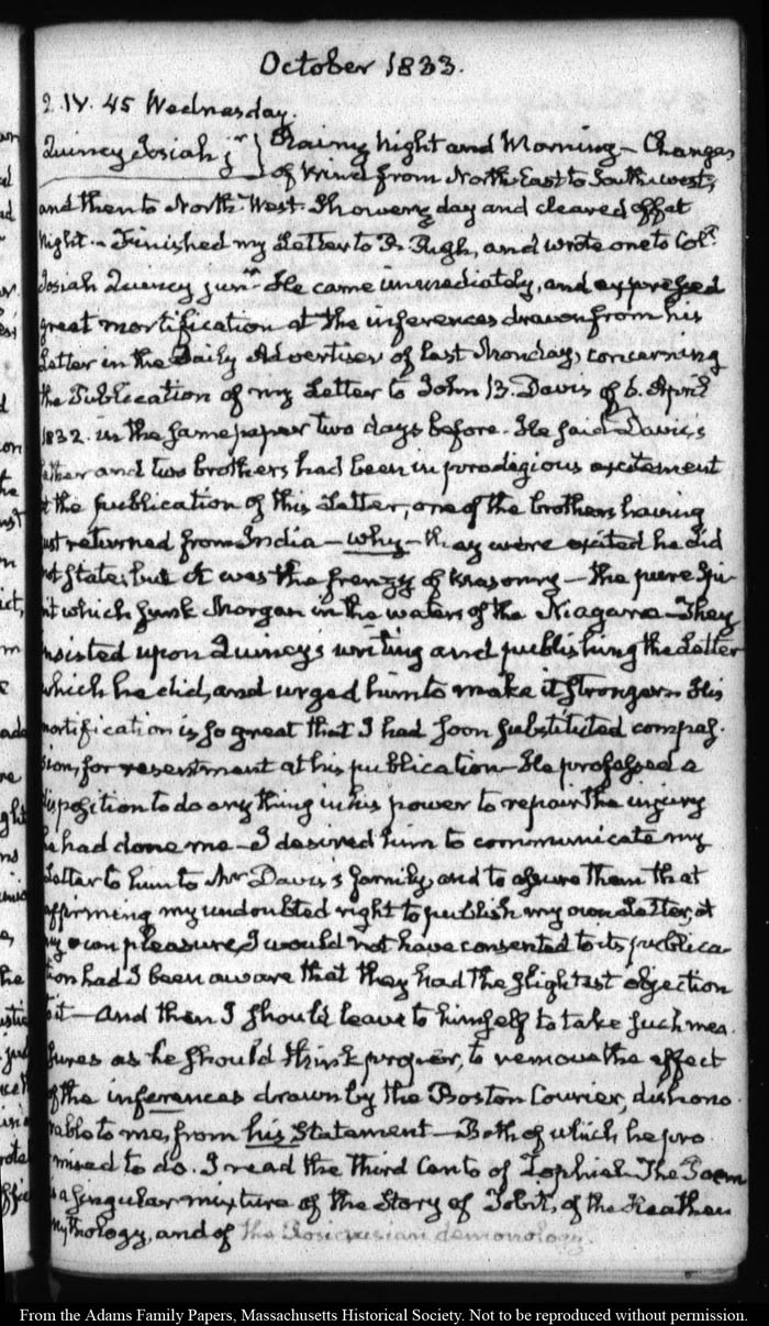View full, authoritative transcriptions with page images of the diaries at John Quincy Adams Digital Diary part of the Primary Source Cooperative at the MHS.
