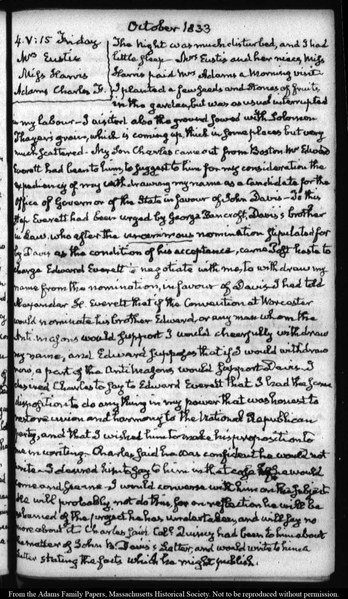 View full, authoritative transcriptions with page images of the diaries at John Quincy Adams Digital Diary part of the Primary Source Cooperative at the MHS.