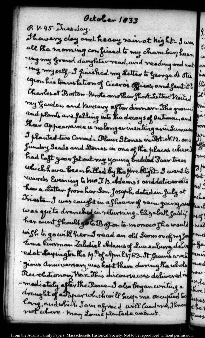 View full, authoritative transcriptions with page images of the diaries at John Quincy Adams Digital Diary part of the Primary Source Cooperative at the MHS.