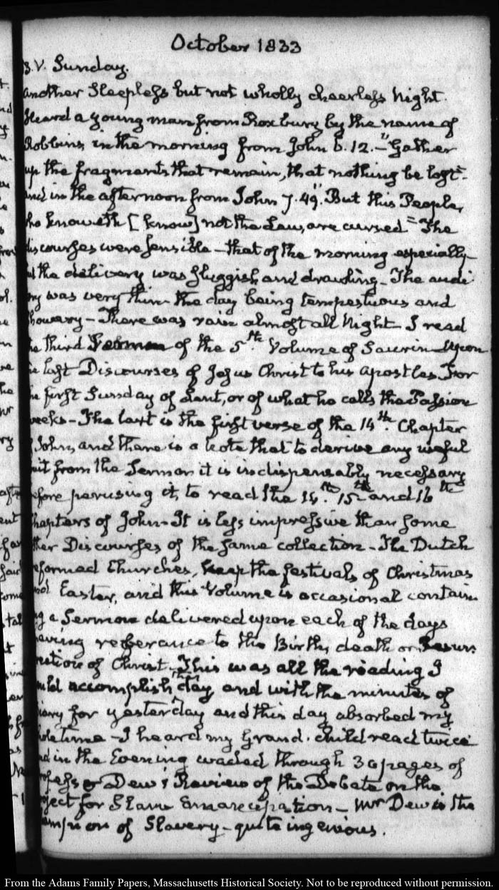View full, authoritative transcriptions with page images of the diaries at John Quincy Adams Digital Diary part of the Primary Source Cooperative at the MHS.