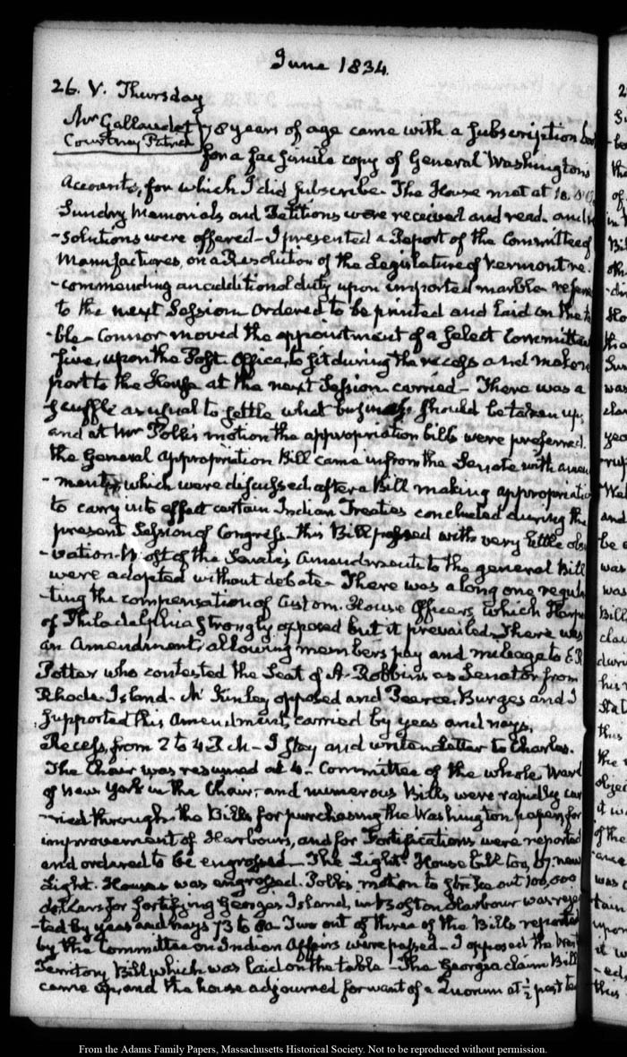View full, authoritative transcriptions with page images of the diaries at John Quincy Adams Digital Diary part of the Primary Source Cooperative at the MHS.