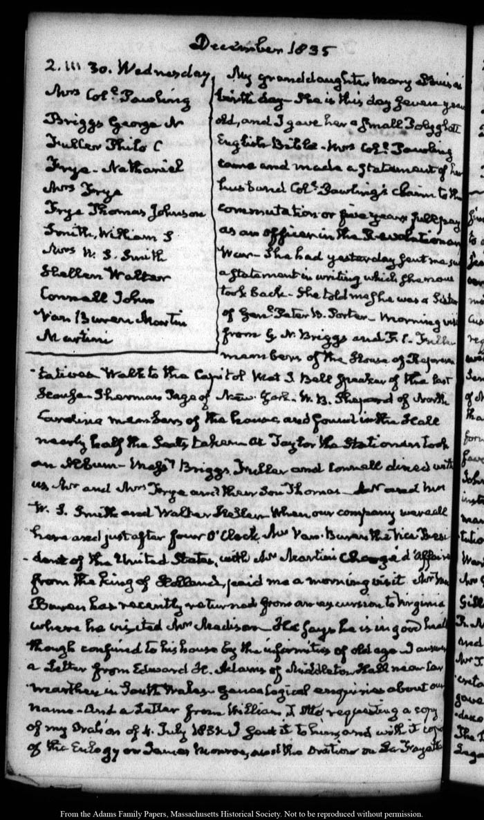 View full, authoritative transcriptions with page images of the diaries at John Quincy Adams Digital Diary part of the Primary Source Cooperative at the MHS.