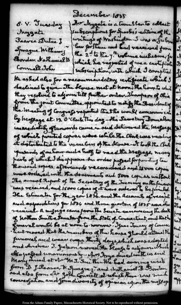 View full, authoritative transcriptions with page images of the diaries at John Quincy Adams Digital Diary part of the Primary Source Cooperative at the MHS.