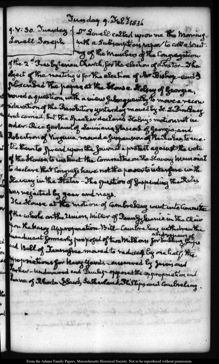View full, authoritative transcriptions with page images of the diaries at John Quincy Adams Digital Diary part of the Primary Source Cooperative at the MHS.