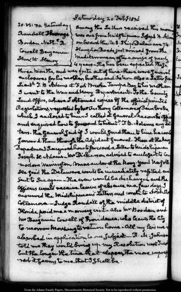 View full, authoritative transcriptions with page images of the diaries at John Quincy Adams Digital Diary part of the Primary Source Cooperative at the MHS.