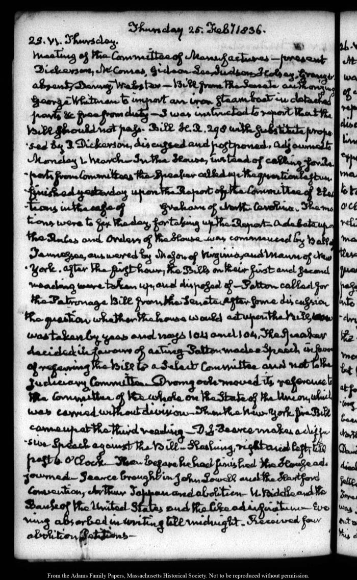 View full, authoritative transcriptions with page images of the diaries at John Quincy Adams Digital Diary part of the Primary Source Cooperative at the MHS.