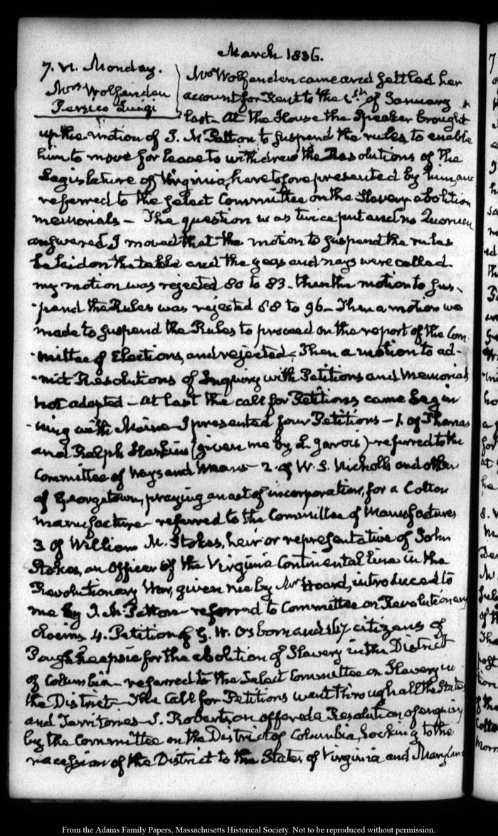 View full, authoritative transcriptions with page images of the diaries at John Quincy Adams Digital Diary part of the Primary Source Cooperative at the MHS.