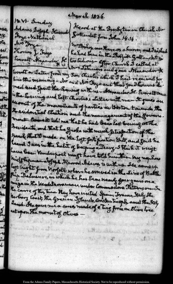 View full, authoritative transcriptions with page images of the diaries at John Quincy Adams Digital Diary part of the Primary Source Cooperative at the MHS.