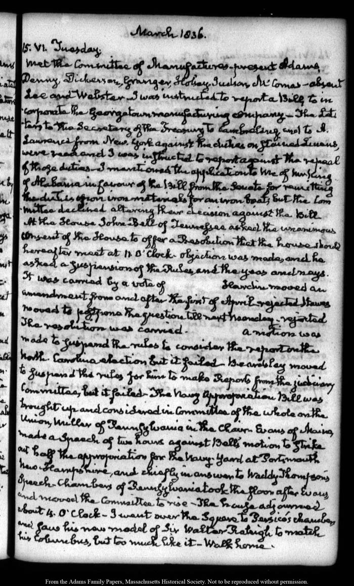 View full, authoritative transcriptions with page images of the diaries at John Quincy Adams Digital Diary part of the Primary Source Cooperative at the MHS.
