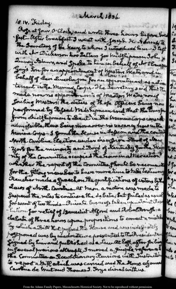 View full, authoritative transcriptions with page images of the diaries at John Quincy Adams Digital Diary part of the Primary Source Cooperative at the MHS.