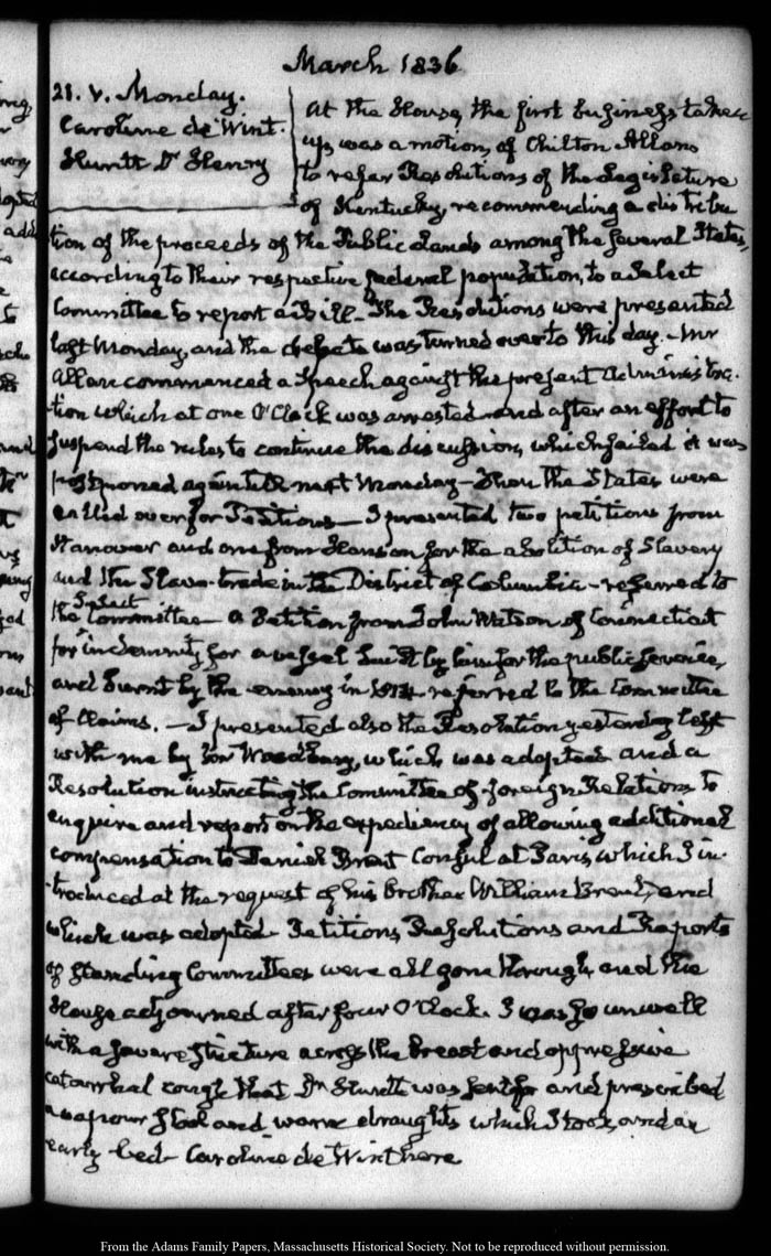 View full, authoritative transcriptions with page images of the diaries at John Quincy Adams Digital Diary part of the Primary Source Cooperative at the MHS.